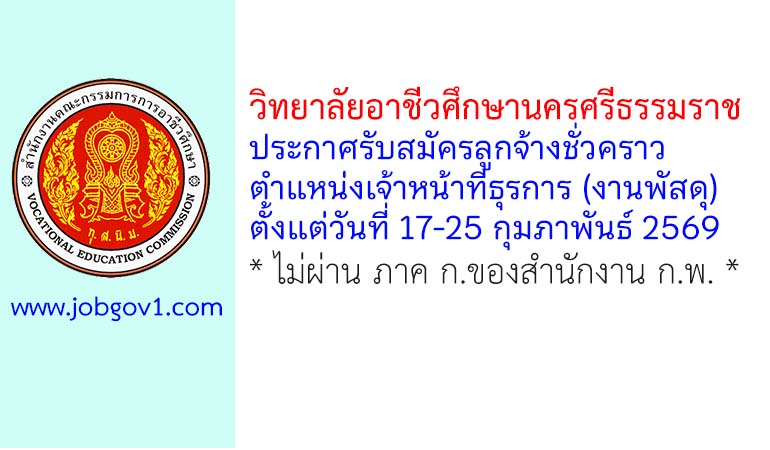 วิทยาลัยอาชีวศึกษานครศรีธรรมราช รับสมัครลูกจ้างชั่วคราว ตำแหน่งเจ้าหน้าที่ธุรการ (งานพัสดุ) ตั้งแต่วันที่ 17-25 กุมภาพันธ์ 2569