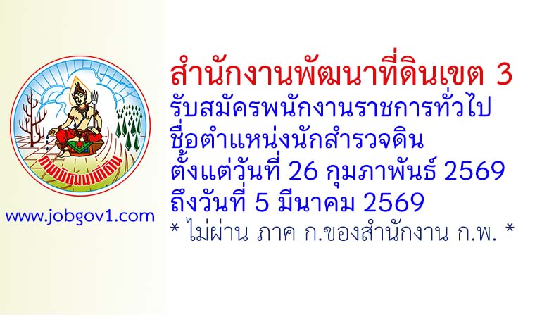 สำนักงานพัฒนาที่ดินเขต 3 รับสมัครพนักงานราชการทั่วไป ตำแหน่งนักสำรวจดิน ตั้งแต่วันที่ 26 กุมภาพันธ์ 2569 ถึงวันที่ 5 มีนาคม 2569