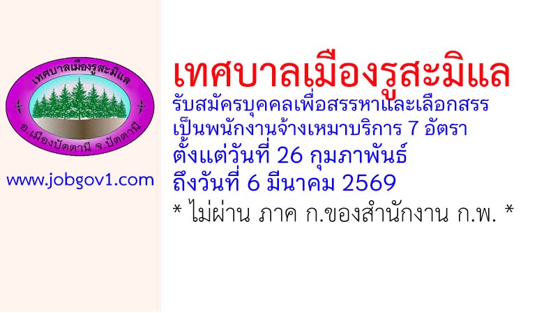 เทศบาลเมืองรูสะมิแล รับสมัครบุคคลเพื่อสรรหาและเลือกสรรเป็นพนักงานจ้างเหมาบริการ 7 อัตรา ตั้งแต่วันที่ 26 กุมภาพันธ์ ถึงวันที่ 6 มีนาคม 2569