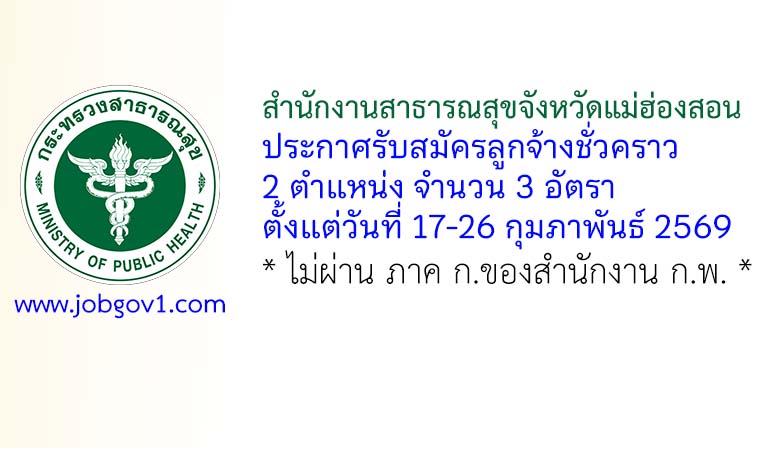 สำนักงานสาธารณสุขจังหวัดแม่ฮ่องสอน รับสมัครลูกจ้างชั่วคราว 2 ตำแหน่ง 3 อัตรา ตั้งแต่วันที่ 17-26 กุมภาพันธ์ 2569