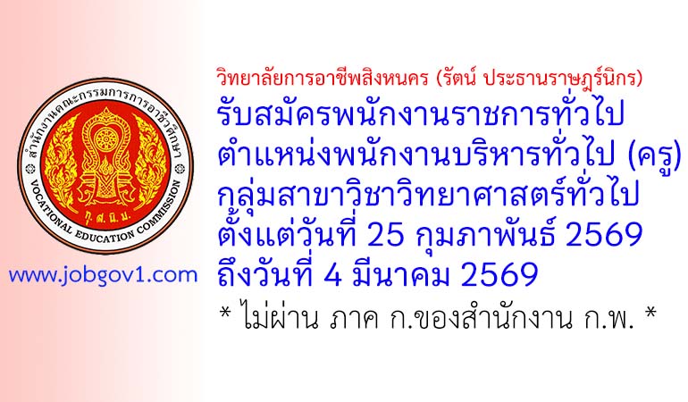 วิทยาลัยการอาชีพสิงหนคร (รัตน์ ประธานราษฎร์นิกร) รับสมัครพนักงานราชการทั่วไป ตำแหน่งพนักงานบริหารทั่วไป (ครู) กลุ่มสาขาวิชาวิทยาศาสตร์ทั่วไป ตั้งแต่วันที่ 25 กุมภาพันธ์ 2569 ถึงวันที่ 4 มีนาคม 2569