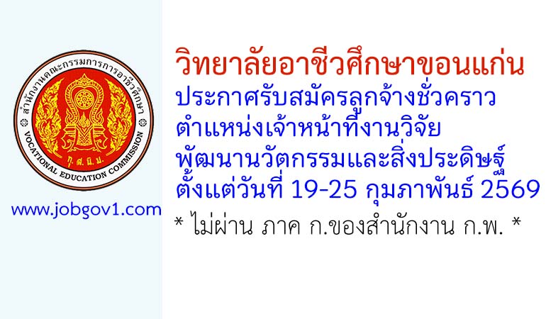 วิทยาลัยอาชีวศึกษาขอนแก่น รับสมัครลูกจ้างชั่วคราว ตำแหน่งเจ้าหน้าที่งานวิจัยพัฒนานวัตกรรมและสิ่งประดิษฐ์ ตั้งแต่วันที่ 19-25 กุมภาพันธ์ 2569