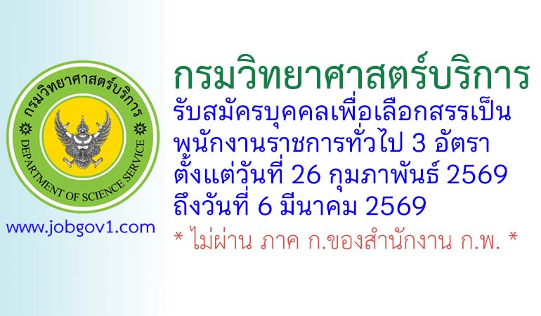 กรมวิทยาศาสตร์บริการ รับสมัครบุคคลเพื่อเลือกสรรเป็นพนักงานราชการทั่วไป 3 อัตรา ตั้งแต่วันที่ 26 กุมภาพันธ์ 2569 ถึงวันที่ 6 มีนาคม 2569