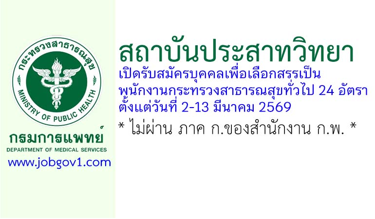 สถาบันประสาทวิทยา รับสมัครบุคคลเพื่อเลือกสรรเป็นพนักงานกระทรวงสาธารณสุขทั่วไป 24 อัตรา ตั้งแต่วันที่ 2-13 มีนาคม 2569