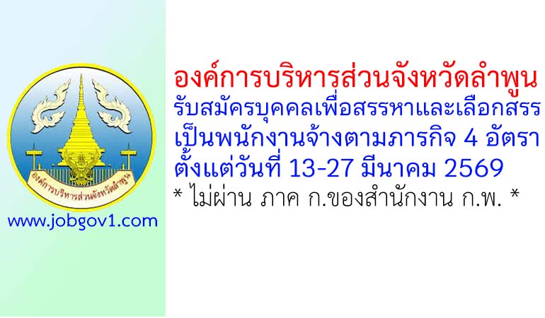 องค์การบริหารส่วนจังหวัดลำพูน รับสมัครบุคคลเพื่อสรรหาและเลือกสรรเป็นพนักงานจ้างตามภารกิจ 4 อัตรา ตั้งแต่วันที่ 13-27 มีนาคม 2569