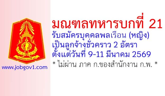 มณฑลทหารบกที่ 21 รับสมัครลูกจ้างชั่วคราว 2 อัตรา ตั้งแต่วันที่ 9-11 มีนาคม 2569