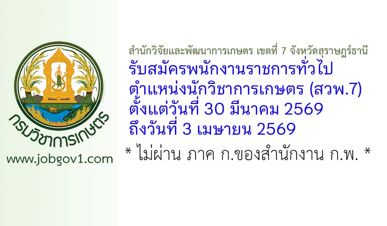 สำนักวิจัยและพัฒนาการเกษตร เขตที่ 7 จังหวัดสุราษฎร์ธานี รับสมัครพนักงานราชการทั่วไป ตำแหน่งนักวิชาการเกษตร (สวพ.7) ตั้งแต่วันที่ 30 มีนาคม 2569 ถึงวันที่ 3 เมษายน 2569