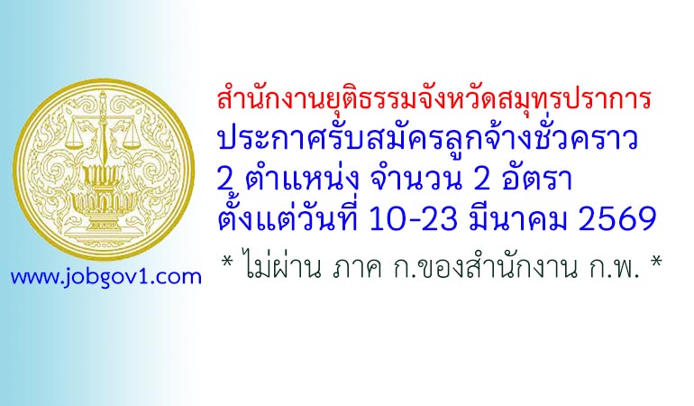 สำนักงานยุติธรรมจังหวัดสมุทรปราการ รับสมัครลูกจ้างชั่วคราว 2 อัตรา ตั้งแต่วันที่ 10-23 มีนาคม 2569