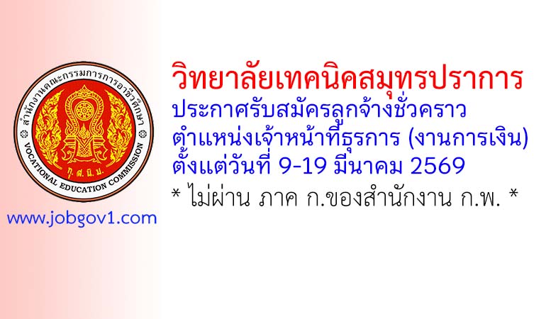 วิทยาลัยเทคนิคสมุทรปราการ รับสมัครลูกจ้างชั่วคราว ตำแหน่งเจ้าหน้าที่ธุรการ (งานการเงิน) ตั้งแต่วันที่ 9-19 มีนาคม 2569