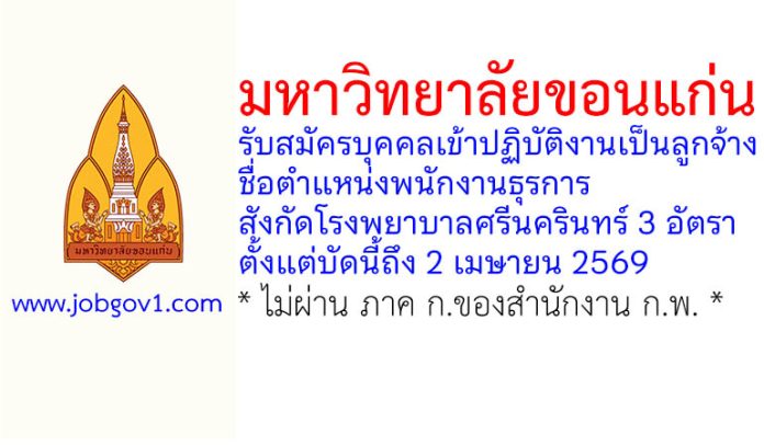 มหาวิทยาลัยขอนแก่น รับสมัครบุคคลเข้าปฏิบัติงานเป็นลูกจ้าง ตำแหน่งพนักงานธุรการ สังกัดโรงพยาบาลศรีนครินทร์ 3 อัตรา ตั้งแต่บัดนี้ถึง 2 เมษายน 2569