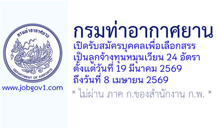 กรมท่าอากาศยาน รับสมัครบุคคลเพื่อเลือกสรรเป็นลูกจ้างทุนหมุนเวียน 24 อัตรา ตั้งแต่วันที่ 19 มีนาคม 2569 ถึงวันที่ 8 เมษายน 2569
