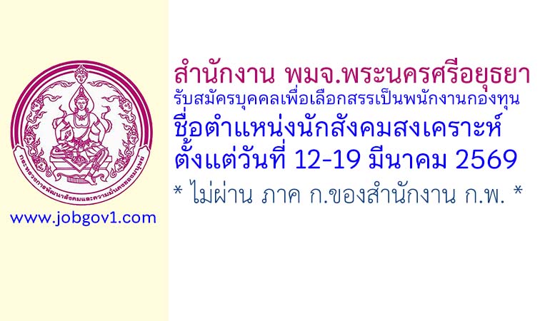 สำนักงาน พมจ.พระนครศรีอยุธยา รับสมัครบุคคลเพื่อเลือกสรรเป็นพนักงานกองทุน ตำแหน่งนักสังคมสงเคราะห์ ตั้งแต่วันที่ 12-19 มีนาคม 2569