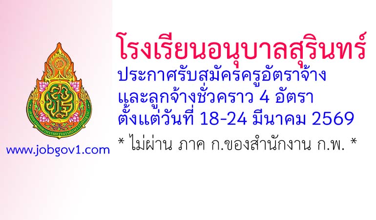 โรงเรียนอนุบาลสุรินทร์ รับสมัครครูอัตราจ้าง และลูกจ้างชั่วคราว 4 อัตรา ตั้งแต่วันที่ 18-24 มีนาคม 2569