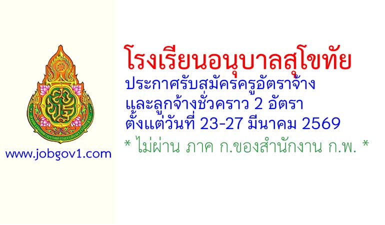 โรงเรียนอนุบาลสุโขทัย รับสมัครครูอัตราจ้าง และลูกจ้างชั่วคราว 2 อัตรา ตั้งแต่วันที่ 23-27 มีนาคม 2569
