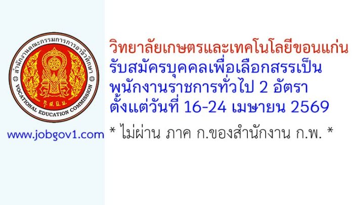 วิทยาลัยเกษตรและเทคโนโลยีขอนแก่น รับสมัครบุคคลเพื่อเลือกสรรเป็นพนักงานราชการทั่วไป 2 อัตรา ตั้งแต่วันที่ 16-24 เมษายน 2569