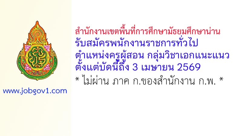 สำนักงานเขตพื้นที่การศึกษามัธยมศึกษาน่าน รับสมัครพนักงานราชการทั่วไป ตำแหน่งครูผู้สอน กลุ่มวิชาเอกแนะแนว ตั้งแต่บัดนี้ถึง 3 เมษายน 2569