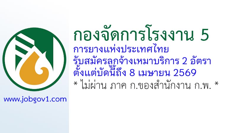 กองจัดการโรงงาน 5 การยางแห่งประเทศไทย รับสมัครลูกจ้างเหมาบริการ 2 อัตรา ตั้งแต่บัดนี้ถึง 8 เมษายน 2569