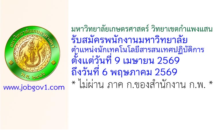 มหาวิทยาลัยเกษตรศาสตร์ วิทยาเขตกำแพงแสน รับสมัครพนักงานมหาวิทยาลัย ตำแหน่งนักเทคโนโลยีสารสนเทศปฏิบัติการ ตั้งแต่วันที่ 9 เมษายน 2569 ถึงวันที่ 6 พฤษภาคม 2569