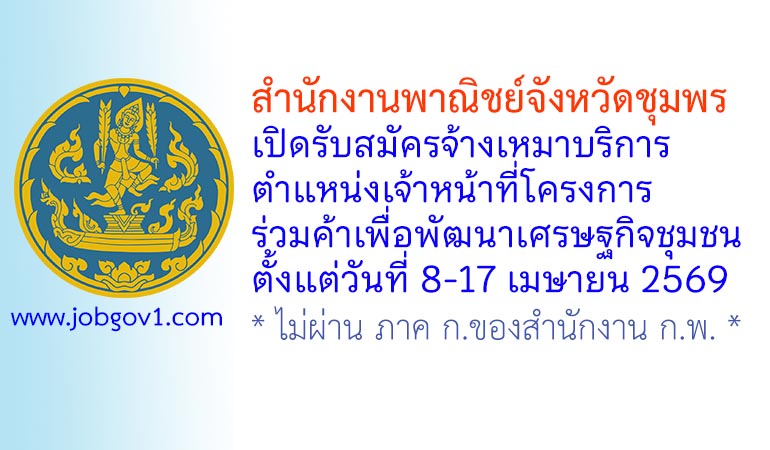 สำนักงานพาณิชย์จังหวัดชุมพร รับสมัครจ้างเหมาบริการ ตำแหน่งเจ้าหน้าที่โครงการร่วมค้าเพื่อพัฒนาเศรษฐกิจชุมชน ตั้งแต่วันที่ 8-17 เมษายน 2569