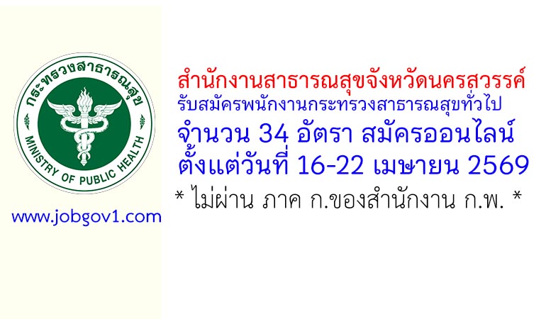 สำนักงานสาธารณสุขจังหวัดนครสวรรค์ รับสมัครพนักงานกระทรวงสาธารณสุขทั่วไป 34 อัตรา ตั้งแต่วันที่ 16-22 เมษายน 2569