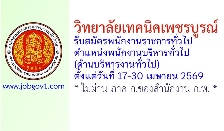 วิทยาลัยเทคนิคเพชรบูรณ์ รับสมัครพนักงานราชการทั่วไป ตำแหน่งพนักงานบริหารทั่วไป (ด้านบริหารงานทั่วไป) ตั้งแต่วันที่ 17-30 เมษายน 2569