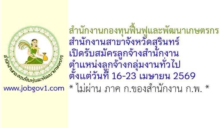 ประกาศสำนักงานกองทุนฟื้นฟูและพัฒนาเกษตรกร สำนักงานสาขาจังหวัดสุรินทร์ เรื่อง รับสมัครคัดเลือกบุคคลเพื่อเป็นลูกจ้างสำนักงานกองทุนฟื้นฟูและพัฒนาเกษตรกร