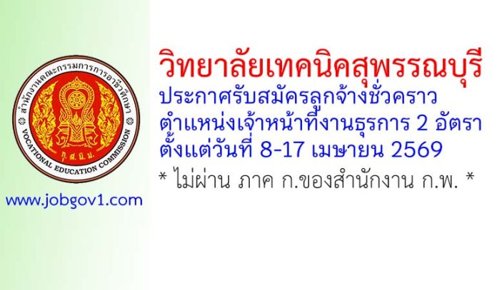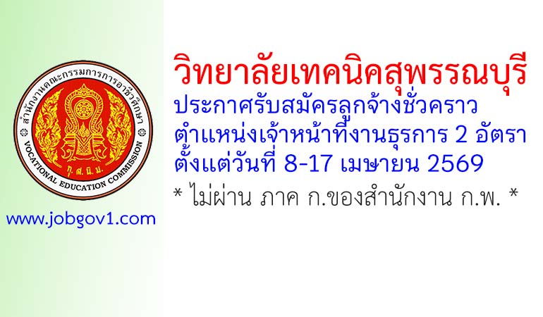วิทยาลัยเทคนิคสุพรรณบุรี รับสมัครลูกจ้างชั่วคราว ตำแหน่งเจ้าหน้าที่งานธุรการ 2 อัตรา ตั้งแต่วันที่ 8-17 เมษายน 2569
