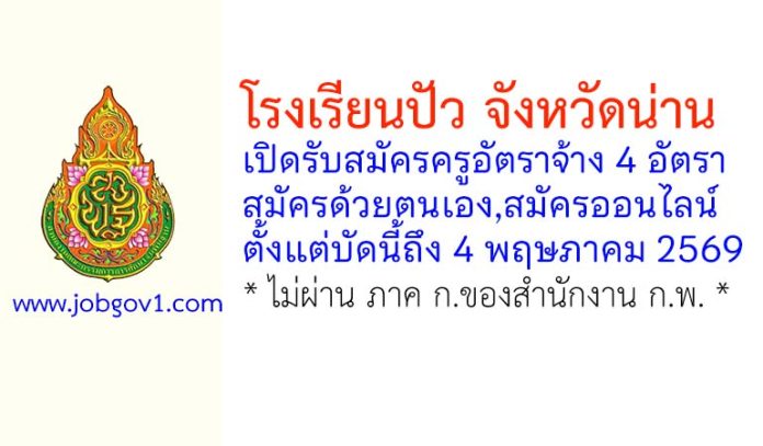โรงเรียนปัว รับสมัครครูอัตราจ้าง 4 อัตรา ตั้งแต่บัดนี้ถึง 4 พฤษภาคม 2569