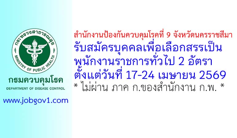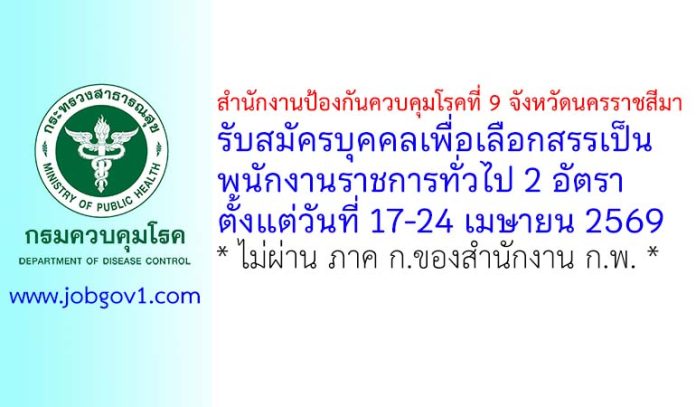 สำนักงานป้องกันควบคุมโรคที่ 9 จังหวัดนครราชสีมา รับสมัครบุคคลเพื่อเลือกสรรเป็นพนักงานราชการทั่วไป 2 อัตรา ตั้งแต่วันที่ 17-24 เมษายน 2569