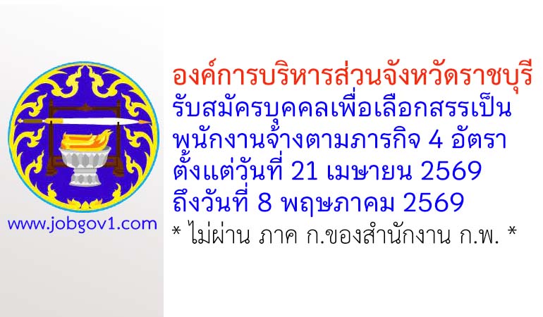 องค์การบริหารส่วนจังหวัดราชบุรี รับสมัครบุคคลเพื่อเลือกสรรเป็นพนักงานจ้างตามภารกิจ 4 อัตรา ตั้งแต่วันที่ 21 เมษายน 2569 ถึงวันที่ 8 พฤษภาคม 2569