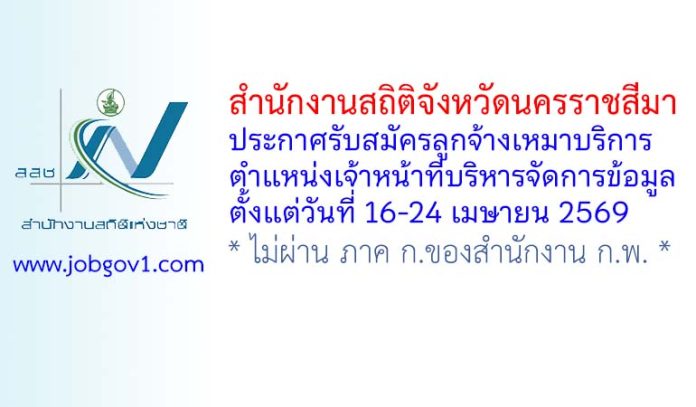 สำนักงานสถิติจังหวัดนครราชสีมา รับสมัครลูกจ้างเหมาบริการ ตำแหน่งเจ้าหน้าที่บริหารจัดการข้อมูล ตั้งแต่วันที่ 16-24 เมษายน 2569