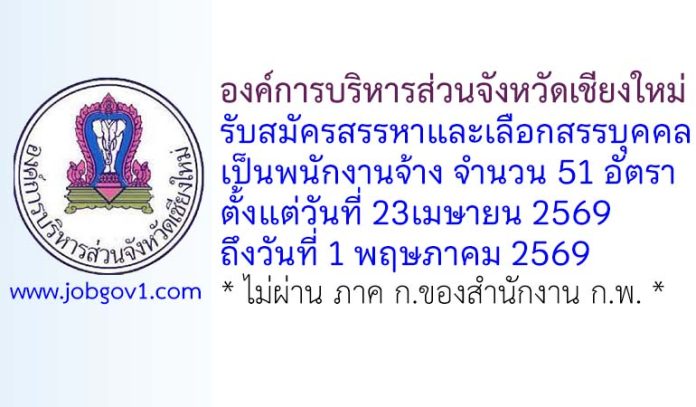 องค์การบริหารส่วนจังหวัดเชียงใหม่ รับสมัครบุคคลเพื่อสรรหาและเลือกสรรเป็นพนักงานจ้าง 51 อัตรา ตั้งแต่วันที่ 23เมษายน 2569 ถึงวันที่ 1 พฤษภาคม 2569