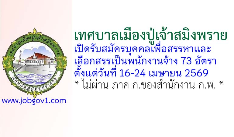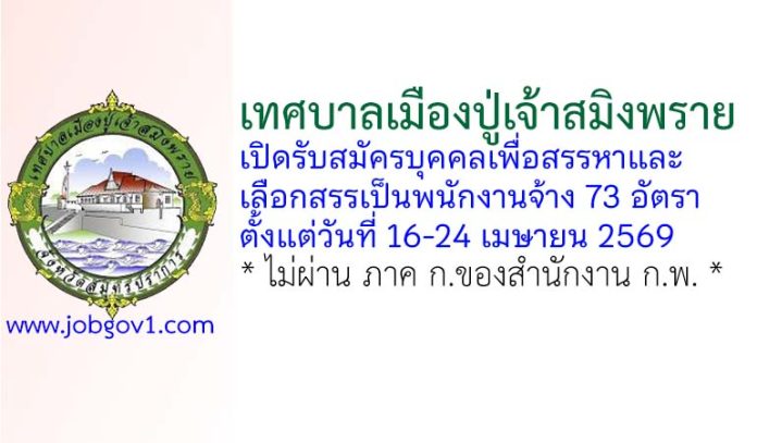 เทศบาลเมืองปู่เจ้าสมิงพราย รับสมัครบุคคลเพื่อสรรหาและเลือกสรรเป็นพนักงานจ้าง 73 อัตรา ตั้งแต่วันที่ 16-24 เมษายน 2569