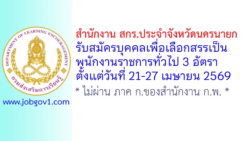 ประกาศสำนักงานส่งเสริมการเรียนรู้ประจำจังหวัดนครนายก เรื่อง รับสมัครบุคคลเพื่อสรรหาและเลือกสรรเป็นพนักงานราชการทั่วไป