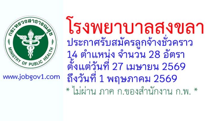 โรงพยาบาลสงขลา รับสมัครลูกจ้างชั่วคราว 14 ตำแหน่ง 28 อัตรา ตั้งแต่วันที่ 27 เมษายน 2569 ถึงวันที่ 1 พฤษภาคม 2569