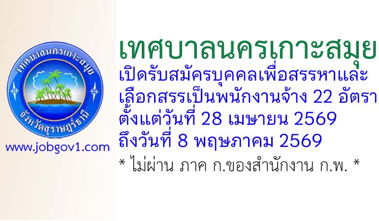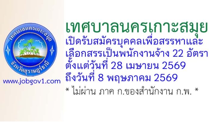 เทศบาลนครเกาะสมุย รับสมัครบุคคลเพื่อสรรหาและเลือกสรรเป็นพนักงานจ้าง 22 อัตรา ตั้งแต่วันที่ 28 เมษายน 2569 ถึงวันที่ 8 พฤษภาคม 2569
