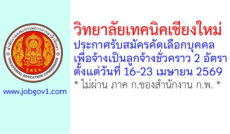 วิทยาลัยเทคนิคเชียงใหม่ รับสมัครลูกจ้างชั่วคราว 2 อัตรา ตั้งแต่วันที่ 16-23 เมษายน 2569