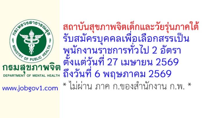 สถาบันสุขภาพจิตเด็กและวัยรุ่นภาคใต้ รับสมัครบุคคลเพื่อเลือกสรรเป็นพนักงานราชการทั่วไป 2 อัตรา ตั้งแต่วันที่ 27 เมษายน 2569 ถึงวันที่ 6 พฤษภาคม 2569
