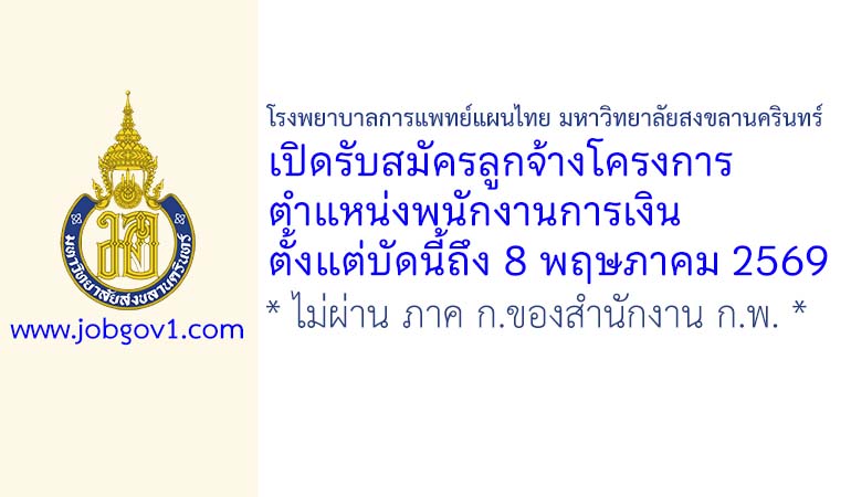 โรงพยาบาลการแพทย์แผนไทย มหาวิทยาลัยสงขลานครินทร์ รับสมัครลูกจ้างโครงการ ตำแหน่งพนักงานการเงิน ตั้งแต่บัดนี้ถึง 8 พฤษภาคม 2569