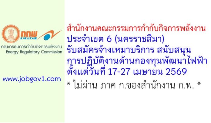 สำนักงานคณะกรรมการกำกับกิจการพลังงาน ประจำเขต 6 (นครราชสีมา) รับสมัครจ้างเหมาบริการ สนับสนุนการปฏิบัติงานด้านกองทุนพัฒนาไฟฟ้า ตั้งแต่วันที่ 17-27 เมษายน 2569