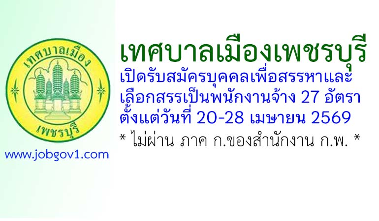 เทศบาลเมืองเพชรบุรี รับสมัครบุคคลเพื่อสรรหาและเลือกสรรเป็นพนักงานจ้าง 27 อัตรา ตั้งแต่วันที่ 20-28 เมษายน 2569