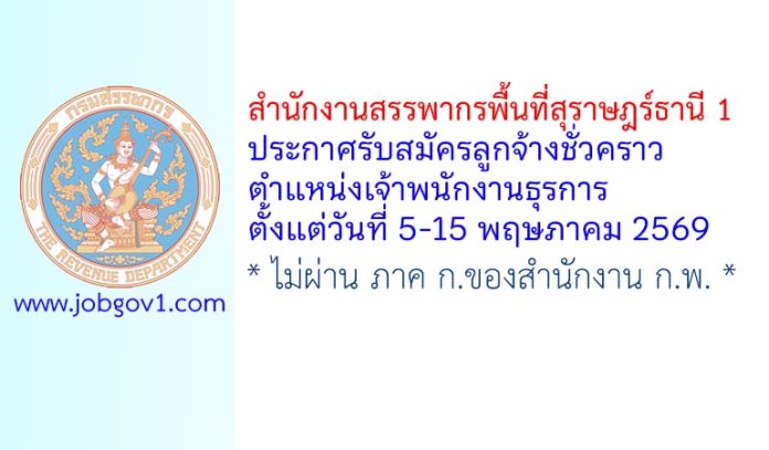 สำนักงานสรรพากรพื้นที่สุราษฎร์ธานี 1 รับสมัครลูกจ้างชั่วคราว ตำแหน่งเจ้าพนักงานธุรการ ตั้งแต่วันที่ 5-15 พฤษภาคม 2569