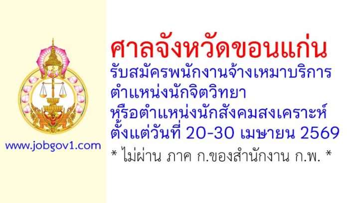 ศาลจังหวัดขอนแก่น รับสมัครพนักงานจ้างเหมาบริการ ตำแหน่งนักจิตวิทยา หรือนักสังคมสงเคราะห์ ตั้งแต่วันที่ 20-30 เมษายน 2569