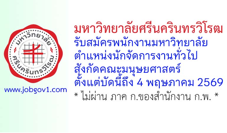 มหาวิทยาลัยศรีนครินทรวิโรฒ รับสมัครพนักงานมหาวิทยาลัย ตำแหน่งนักจัดการงานทั่วไป สังกัดคณะมนุษยศาสตร์ ตั้งแต่บัดนี้ถึง 4 พฤษภาคม 2569