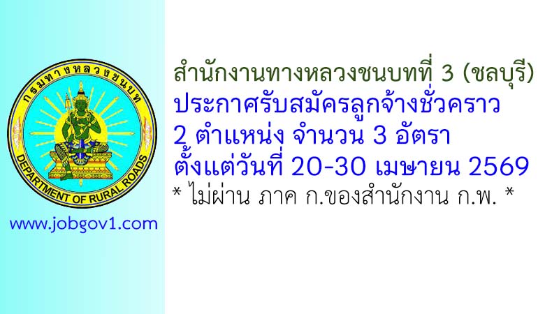 สำนักงานทางหลวงชนบทที่ 3 (ชลบุรี) รับสมัครลูกจ้างชั่วคราว 3 อัตรา ตั้งแต่วันที่ 20-30 เมษายน 2569