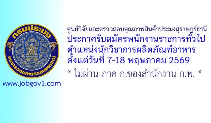 ศูนย์วิจัยและตรวจสอบคุณภาพสินค้าประมงสุราษฎร์ธานี รับสมัครพนักงานราชการทั่วไป ตำแหน่งนักวิชาการผลิตภัณฑ์อาหาร ตั้งแต่วันที่ 7-18 พฤษภาคม 2569