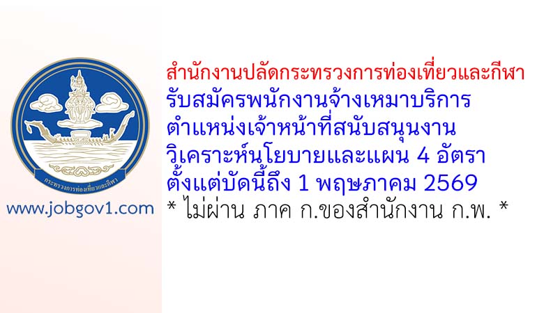สำนักงานปลัดกระทรวงการท่องเที่ยวและกีฬา รับสมัครพนักงานจ้างเหมาบริการ ตำแหน่งเจ้าหน้าที่สนับสนุนงานวิเคราะห์นโยบายและแผน 4 อัตรา ตั้งแต่บัดนี้ถึง 1 พฤษภาคม 2569