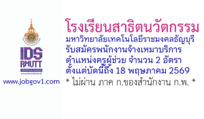 โรงเรียนสาธิตนวัตกรรม มหาวิทยาลัยเทคโนโลยีราชมงคลธัญบุรี รับสมัครพนักงานจ้างเหมาบริการ ตำแหน่งครูผู้ช่วย 2 อัตรา ตั้งแต่บัดนี้ถึง 18 พฤษภาคม 2569