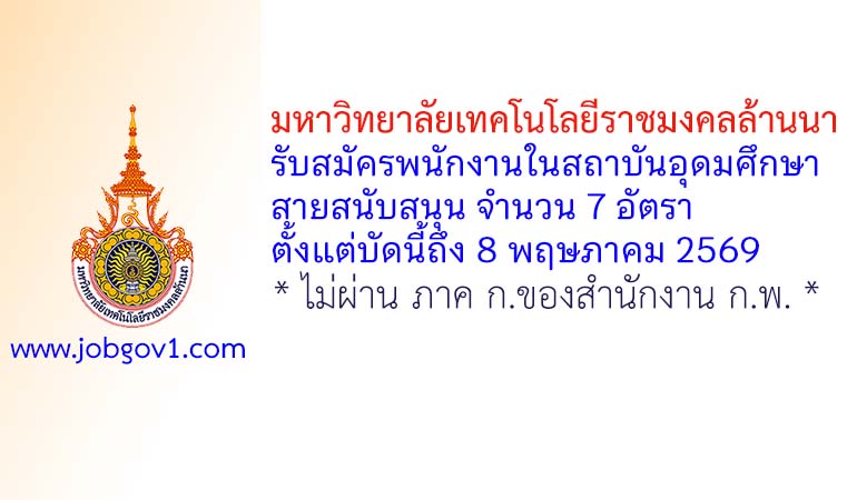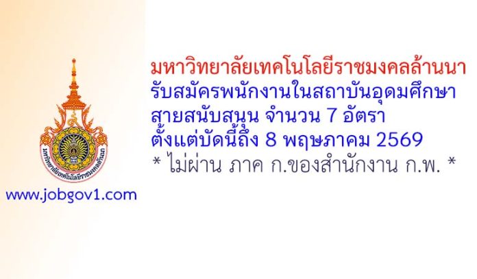 มหาวิทยาลัยเทคโนโลยีราชมงคลล้านนา รับสมัครพนักงานในสถาบันอุดมศึกษา สายสนับสนุน จำนวน 7 อัตรา ตั้งแต่บัดนี้ถึง 8 พฤษภาคม 2569