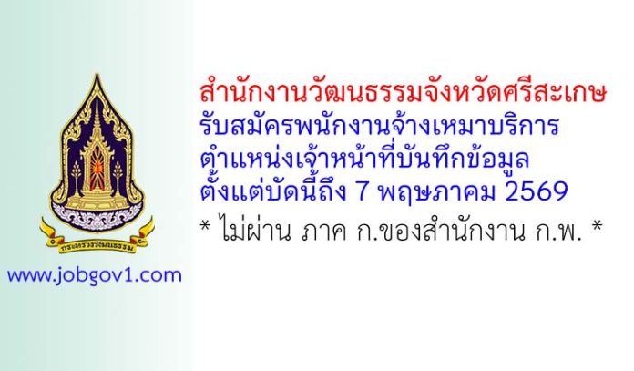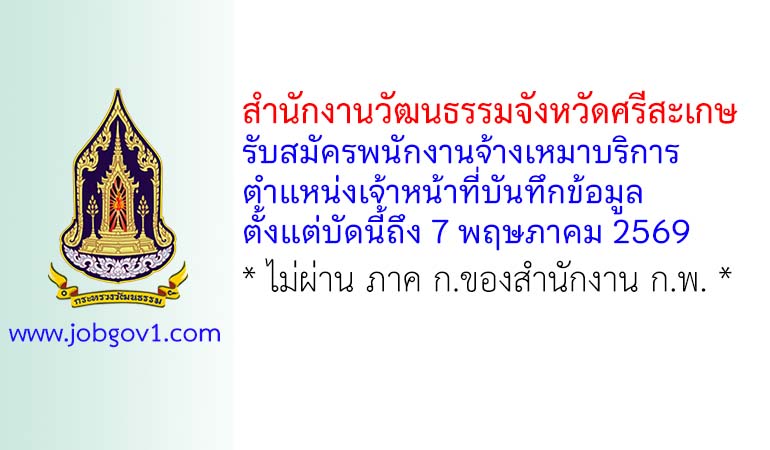 สำนักงานวัฒนธรรมจังหวัดศรีสะเกษ รับสมัครพนักงานจ้างเหมาบริการ ตำแหน่งเจ้าหน้าที่บันทึกข้อมูล ตั้งแต่บัดนี้ถึง 7 พฤษภาคม 2569